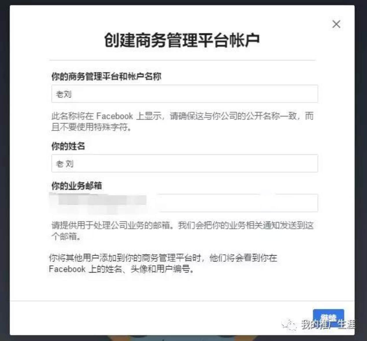 點(diǎn)擊繼續(xù),然后添加你的業(yè)務(wù)詳細(xì)信息,點(diǎn)擊提交 。