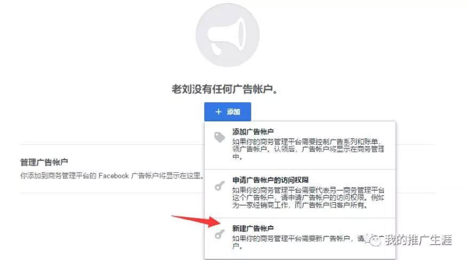 然后同樣點(diǎn)擊左側(cè)的“廣告賬戶”,然后點(diǎn)擊“新建廣告賬戶”,輸入信息,然后開通全部權(quán)限,這樣一個(gè)新的廣告賬戶就生成了。