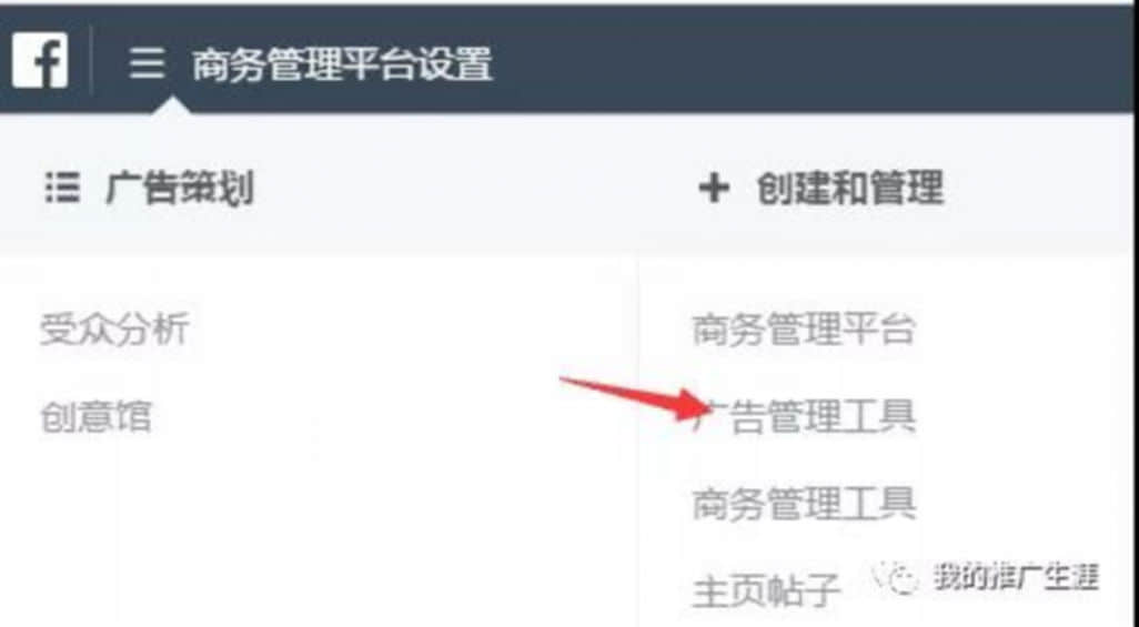然后點(diǎn)擊“廣告管理工具”,你就可以用剛創(chuàng)建的新的廣告賬戶來跑廣告了。