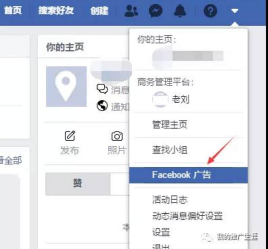 這個(gè)相對(duì)而言就會(huì)簡單很多,直接登入你的facebook賬號(hào),點(diǎn)擊右上角的箭頭,可以看到“Facebook廣告”,點(diǎn)擊進(jìn)入,就可以直接投放廣告了。