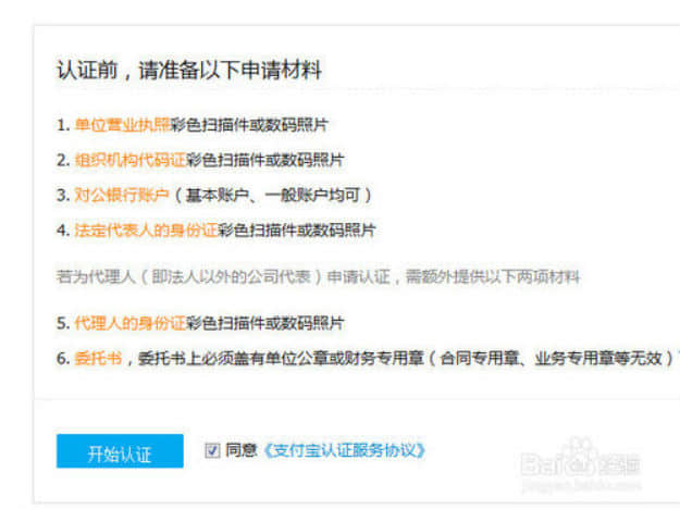 然后會(huì)提示你需要準(zhǔn)備什么資料。如圖所示,需要營(yíng)業(yè)執(zhí)照,組織機(jī)構(gòu)代碼,對(duì)公銀行賬戶(hù),法人身份證等。如果不是法人開(kāi)店還需要:代理人身份證,委托書(shū)。
