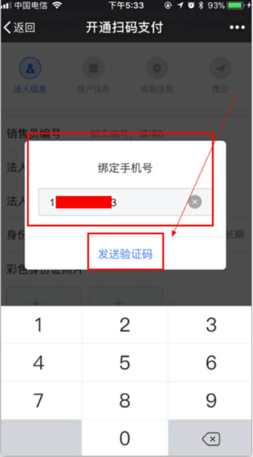 5、輸入手機(jī)號(hào)碼》》》發(fā)送驗(yàn)證碼》》》輸入驗(yàn)證碼;建議填寫(xiě)商戶(hù)老板或者負(fù)責(zé)人的手機(jī)號(hào)。