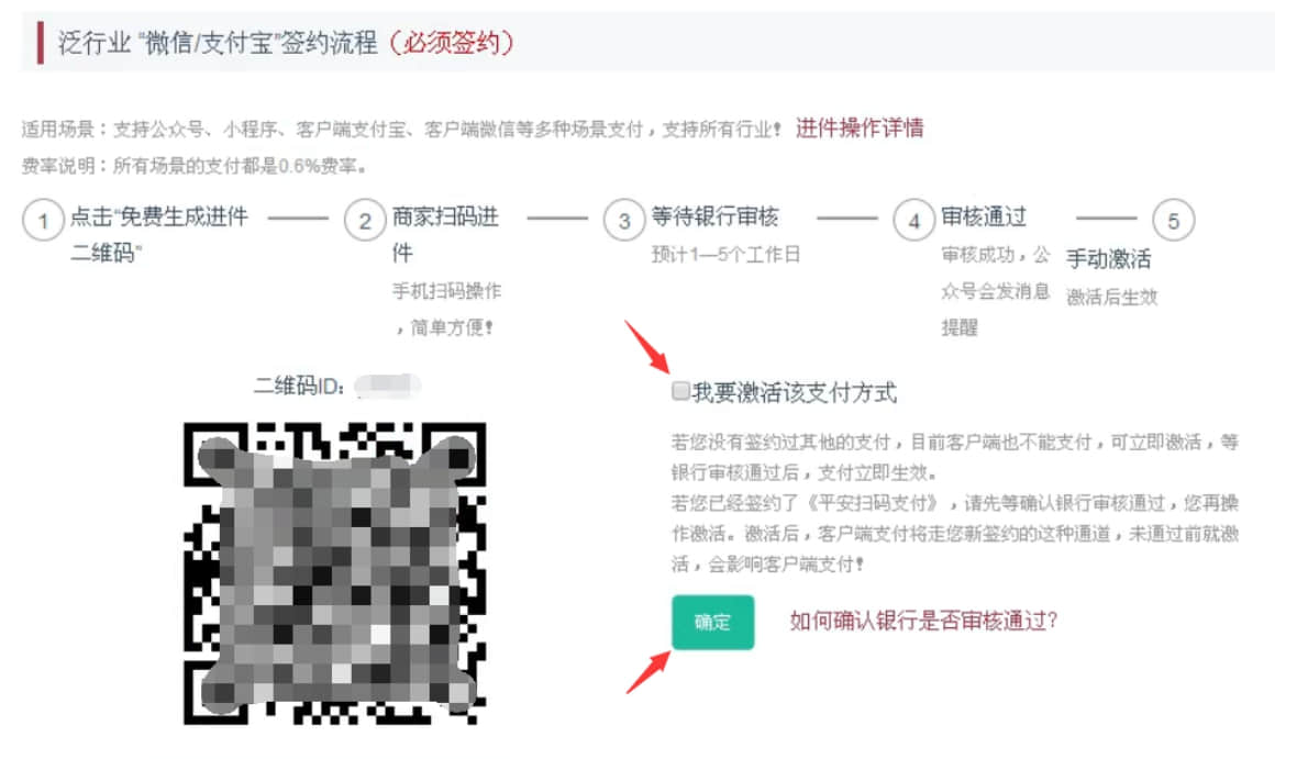 3、微信掃描生成的【進(jìn)件二維碼】,提交商戶(hù)資料進(jìn)行申請(qǐng);審核通過(guò)后,勾選【我要激活該支付方式】,然后,點(diǎn)擊確定即可!