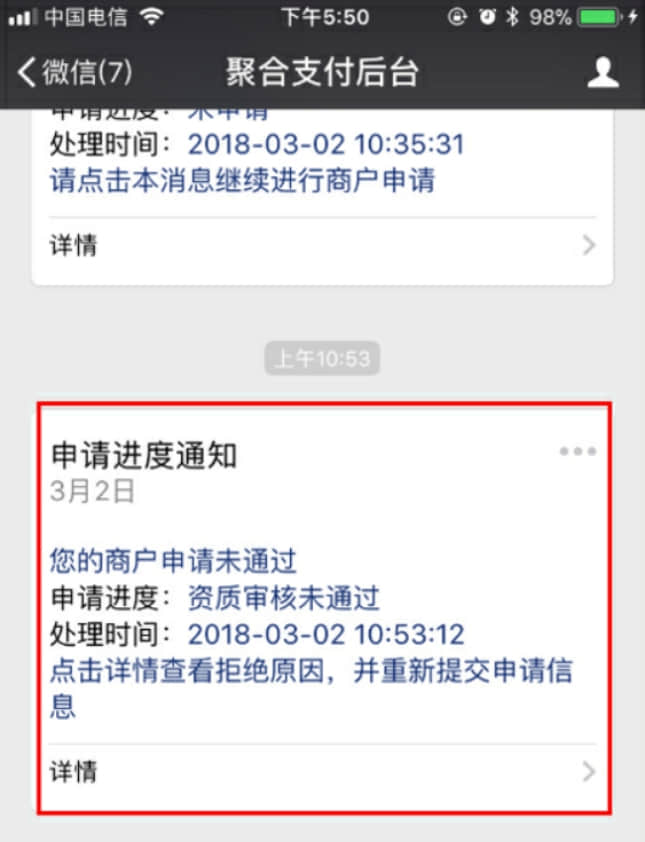 若未審核通過(guò),點(diǎn)擊詳情查看未審核通過(guò)原因,重新更改提交資料。